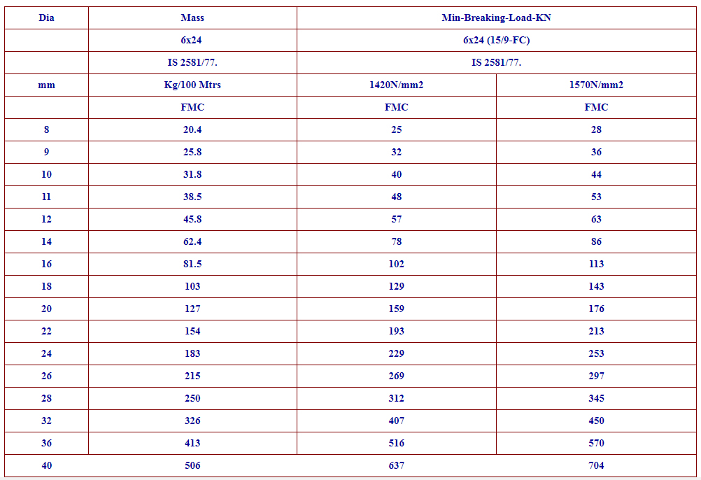Mass & Breaking Load Table